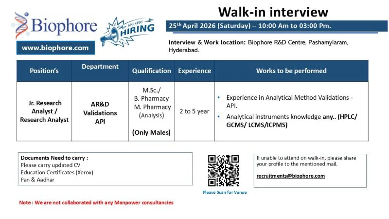 The pharmaceutical R&D sector is rapidly expanding, especially in analytical research and API validation. The Biophore India AR&D API Validation Jobs offer an excellent opportunity for professionals with experience in analytical method validation and instrumentation. This walk-in drive is ideal for candidates looking to advance their careers in a USFDA-compliant R&D environment with strong technical exposure.