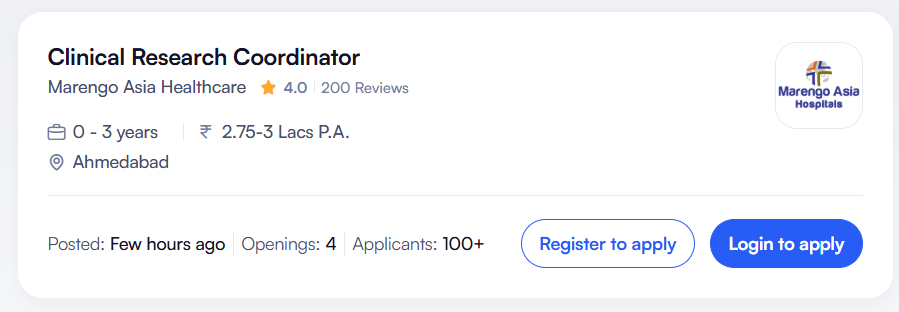 Clinical Research Coordinator Marengo Asia Healthcare job for pharma jobs freshers apply online Ahmedabad clinical research opportunity with salary details eligibility criteria