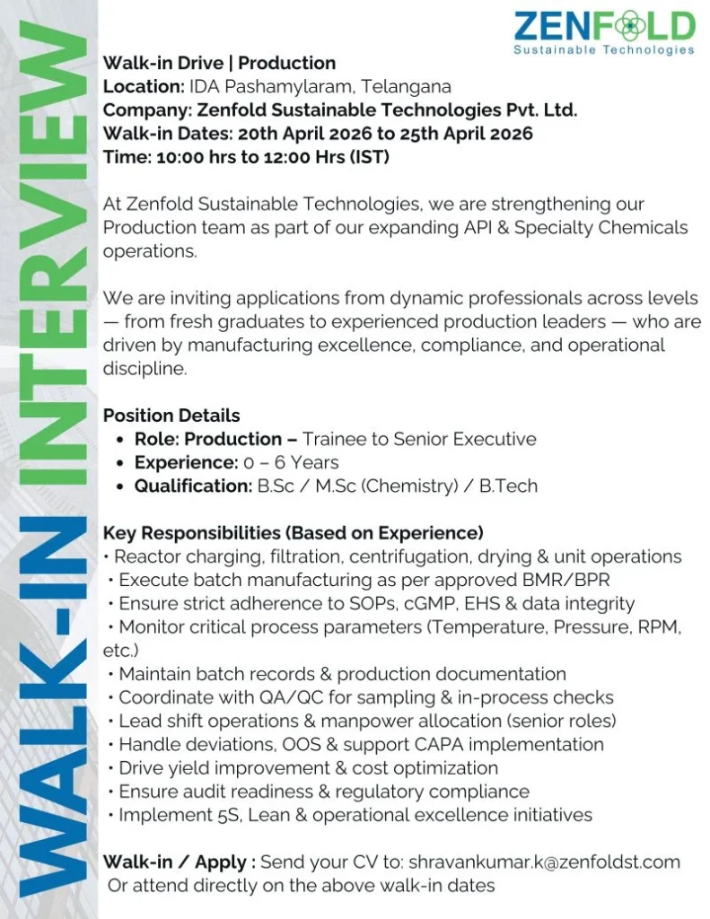 If you are looking to start or grow your career in API and specialty chemical manufacturing, the Production Trainee Senior Executive Zenfold Sustainable opportunity is a great option. This walk-in drive is open for freshers as well as experienced professionals, offering hands-on exposure to real-time production processes in a fast-growing organization.