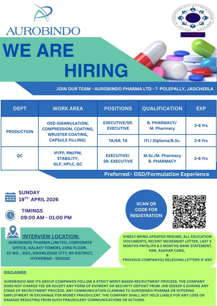 Looking to advance your career in pharmaceutical manufacturing and quality control? The Production Quality Control Aurobindo Pharma walk-in drive offers an excellent opportunity for experienced candidates in OSD and formulation domains. This hiring drive is ideal for professionals seeking hands-on exposure in regulated environments within a globally recognized pharma company.