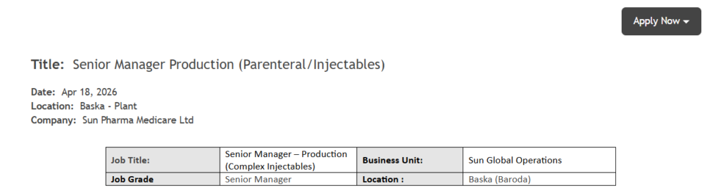 The Senior Manager Production (Parenteral/Injectables) at Sun Pharma Medicare Ltd 2026 is a high-level opportunity for experienced professionals in pharmaceutical manufacturing. With leadership responsibilities, global exposure, and strong career growth potential, this role is ideal for those looking to advance in the injectables domain. Apply early to take the next step in your career.