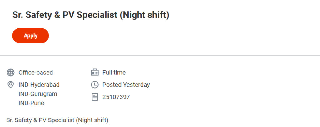 | Job Title | Sr Safety & PV Specialist (Night Shift) |