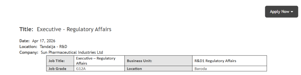 The Executive – Regulatory Affairs at Sun Pharmaceutical Industries Ltd 2026 role is a strong opportunity for professionals seeking growth in regulatory affairs. With exposure to global markets, structured career development, and a reputable organization, this job can significantly boost your pharma career. Apply early to secure your chance.