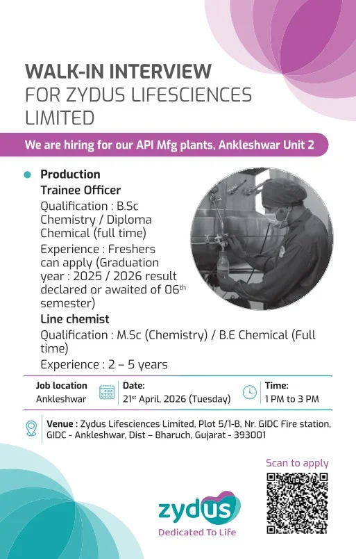 If you are searching for entry-level or mid-level opportunities in pharmaceutical manufacturing, the Production Trainee Officer Zydus Lifesciences hiring drive is worth exploring. This walk-in opportunity is open to both freshers and experienced candidates, offering hands-on exposure in API manufacturing. With a strong industry presence, Zydus provides an excellent platform to start or grow your pharma production career.